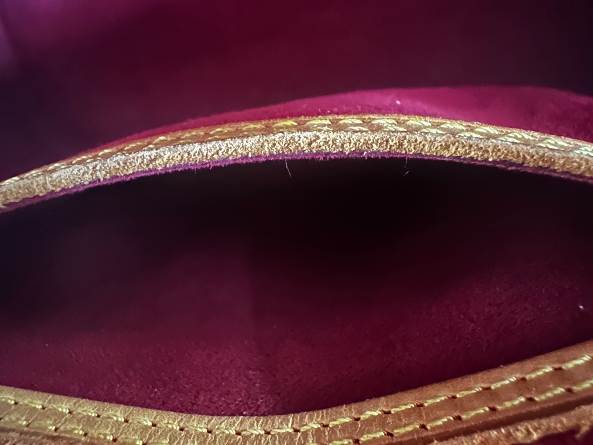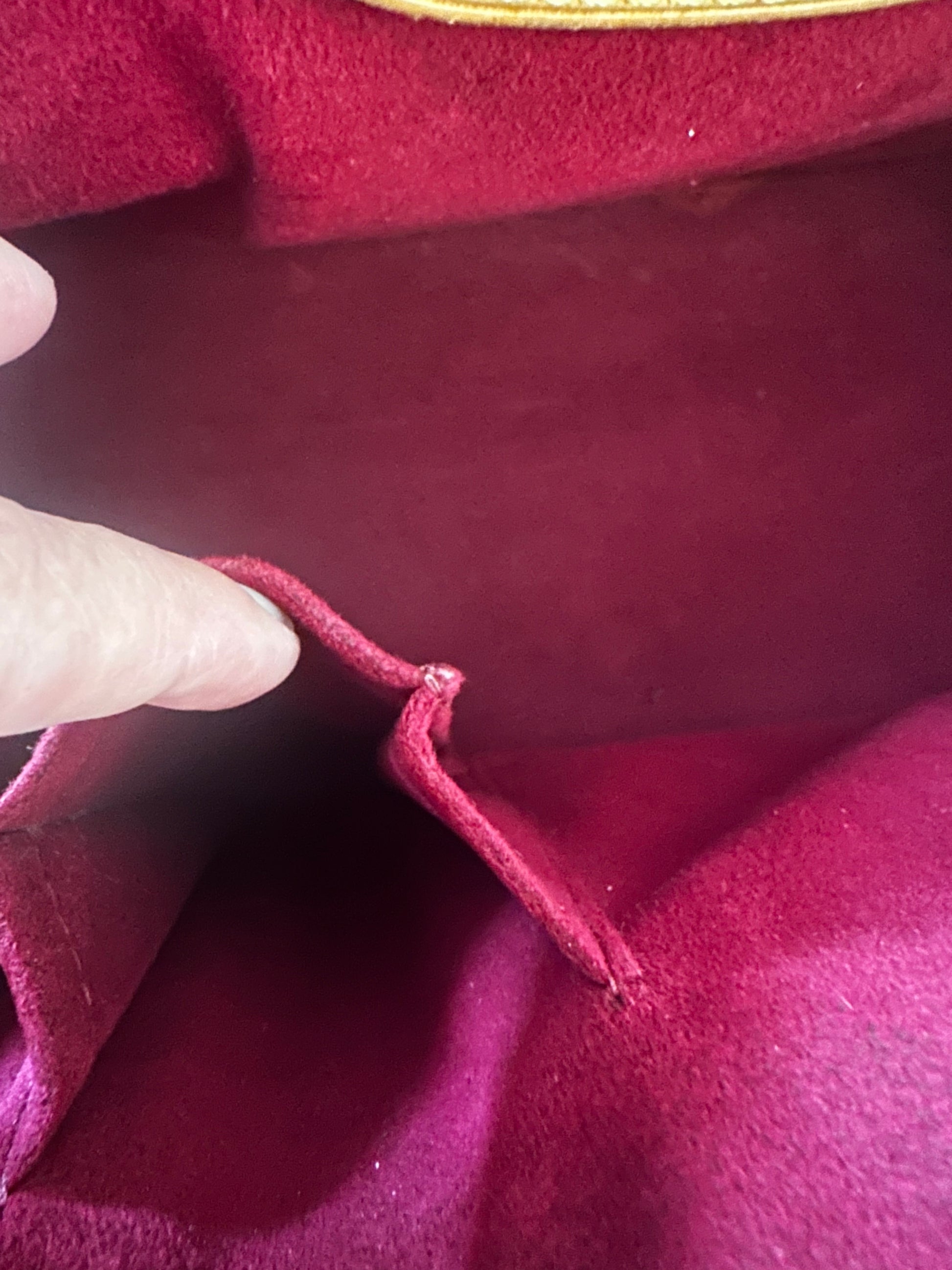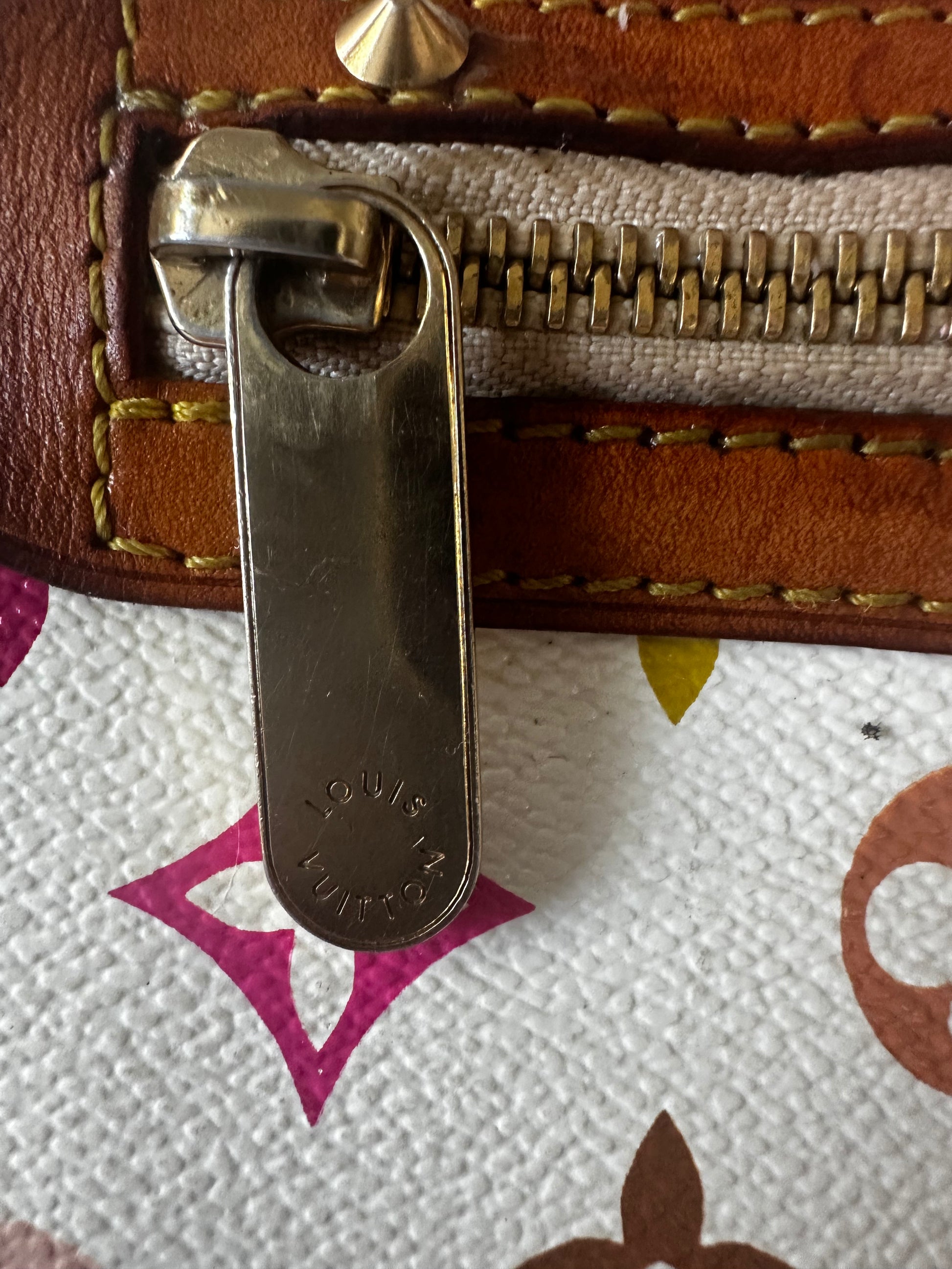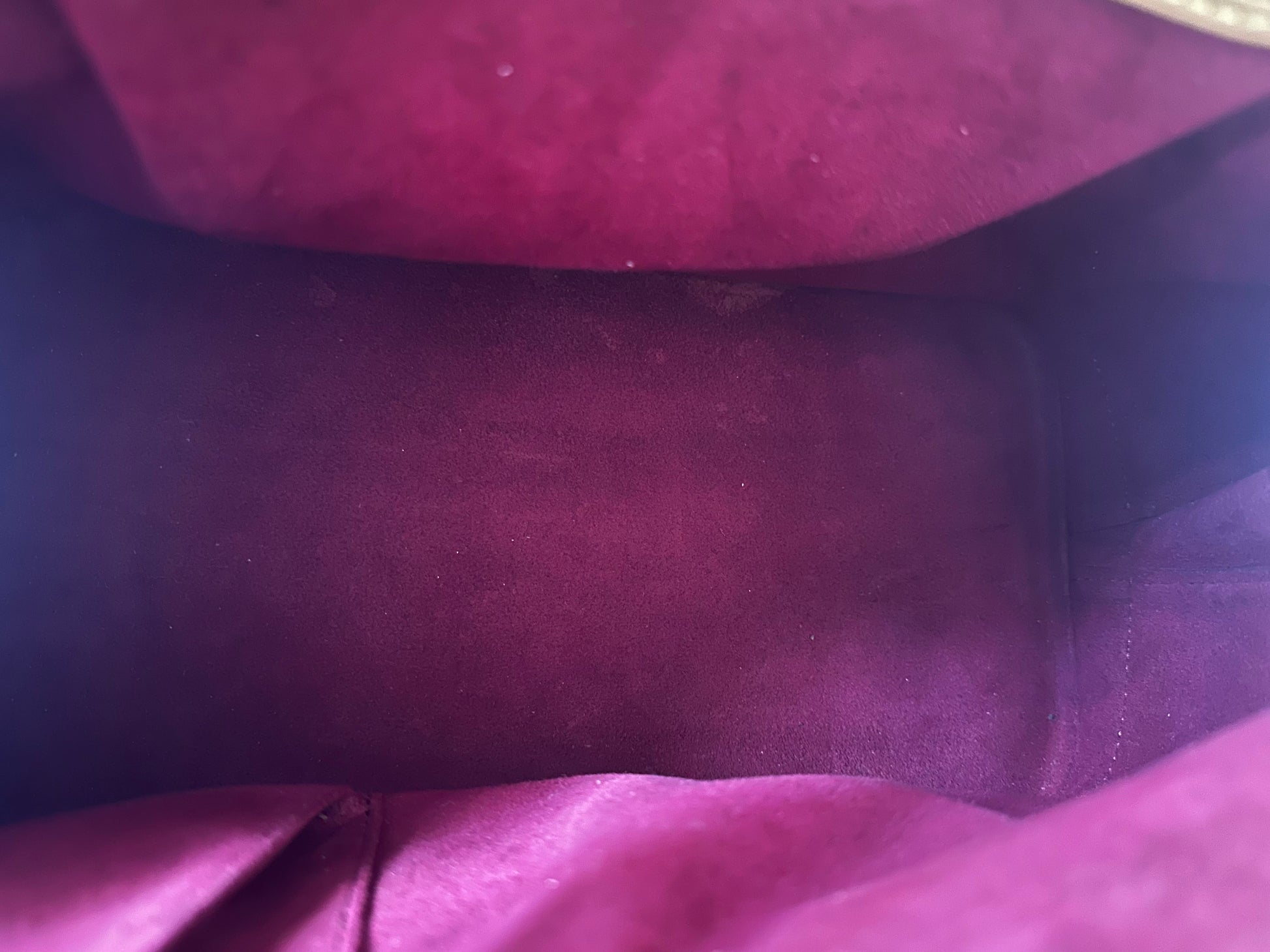 - Details: Heavy patina at handles; slight discoloration and patina on vachetta at bottom. Minor scratches at hardware; shape has relaxed due to wear. Inside pristine. Comes with original dustbag.